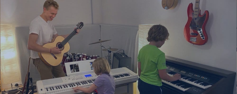 Ihr Kind lernt die Grundlagen für Gitarre, Klavier und Schlagzeug. Mit nur 48 Minuten Üben pro Woche (dank unserer exklusiven 12 Minuten Videos, die Ihr Kind durch den gesamten Prozess leiten.)
